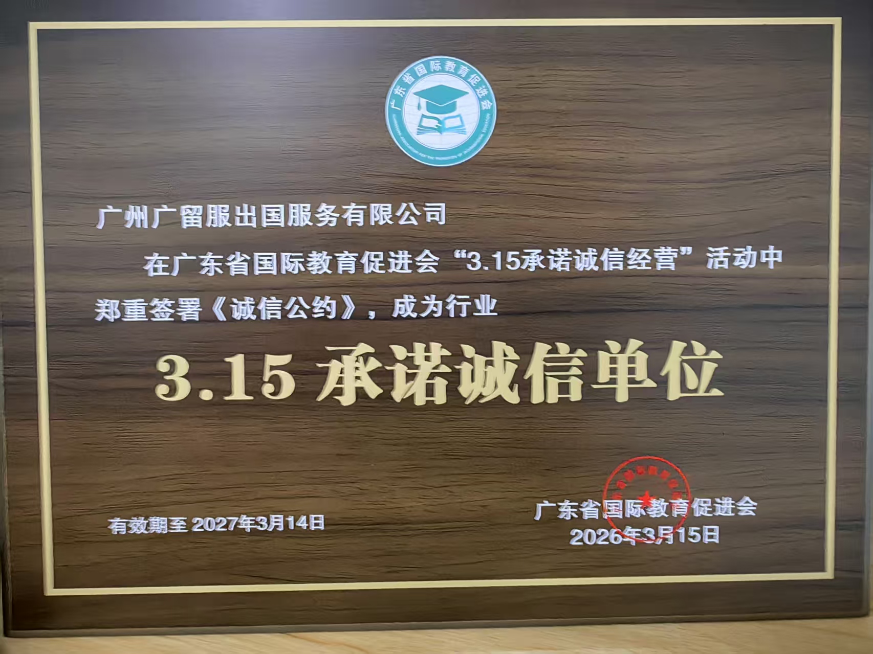 广州广留服出国服务有限公司获得广东省国际教育促进会2026年315承诺诚信单位牌匾。
