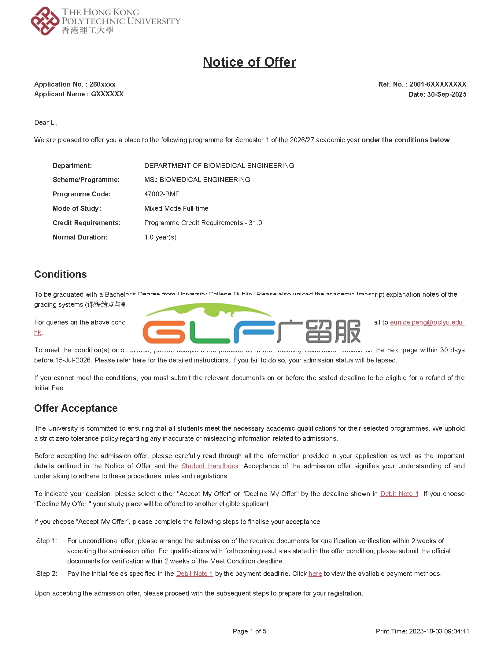 G同学获得香港理工大学首批录取