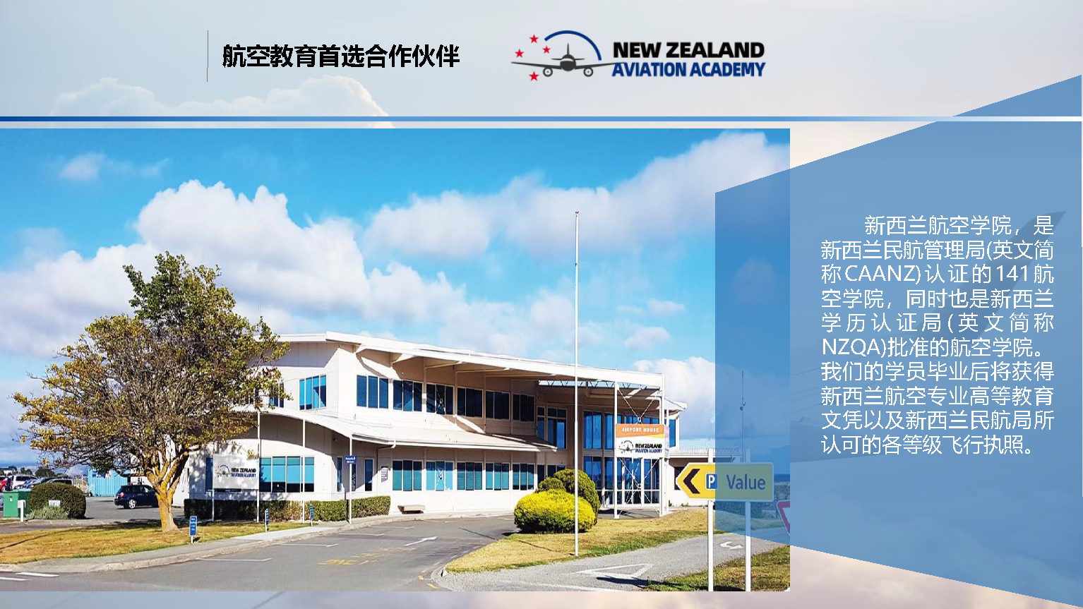 新西兰航空学院,以飞行员成功就业为导向,以教授最专业、最前沿的航空器驾驶技能为宗旨,致力于为国际民用运输航空和通用航空领域培养高素质、高标准、高技术水平的飞行员。