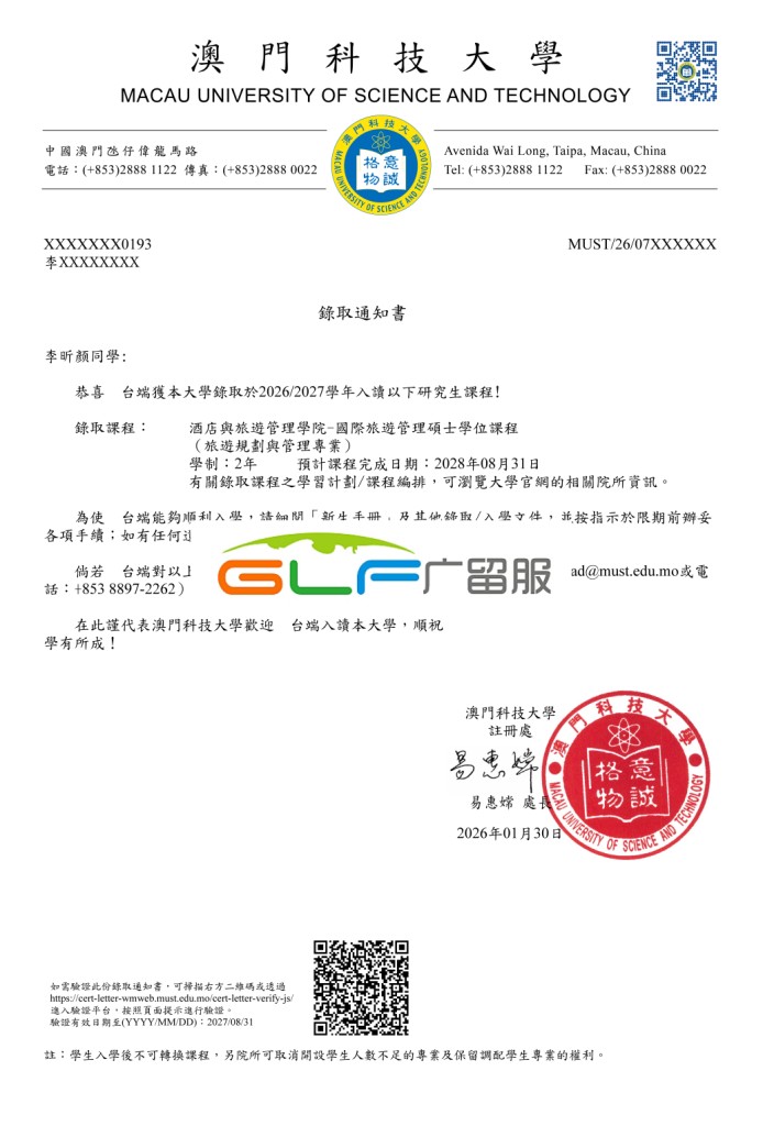 L同学是北京某大学的毕业生,在广留服资深顾问的帮助下顺利获得当下热门专业澳门科技大学的國際旅遊管理碩士學位課程 (旅遊規劃與管理專業)录取。